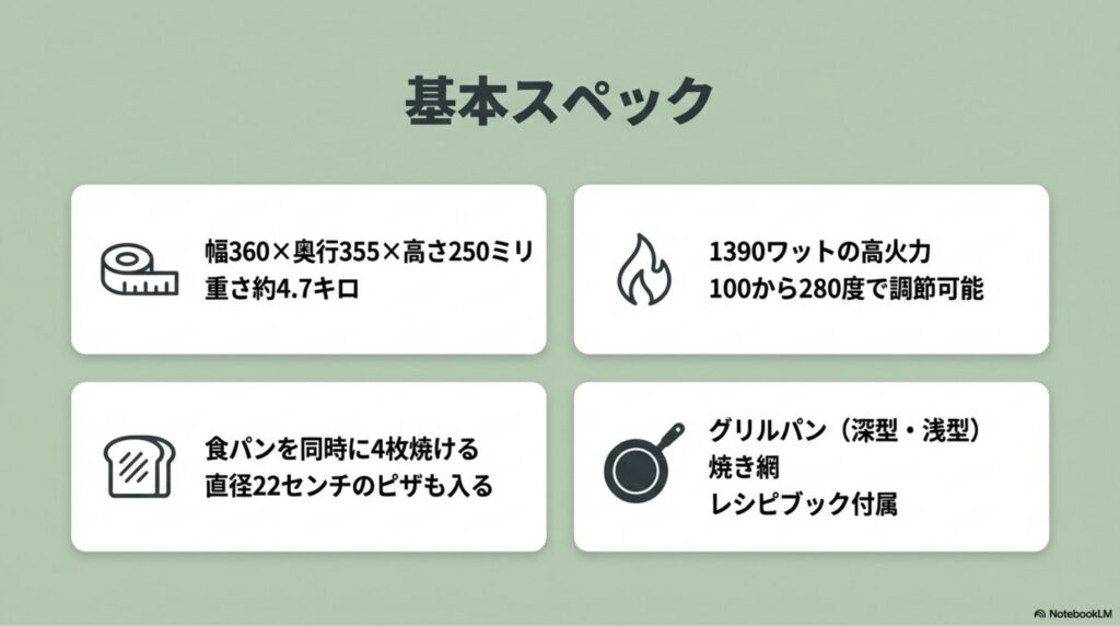 実際の口コミでも「グリルパンが重宝している」「スーパーのピザを温めると出来たてのような仕上がりになる」「揚げ物の温め直しもサクッと仕上がる」という声が多数集まっています(出典:マイベスト・口コミサイト)。付属品として浅型・深型の2種類のグリルパンが入っており、用途によって使い分けが可能です。