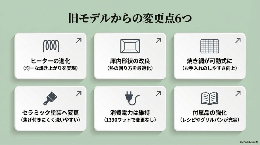 変更点4:グリルパン塗装がセラミックへ 耐熱シリコン塗装からセラミック塗装に変更され、焦げ付きにくさと洗いやすさが改善されました。