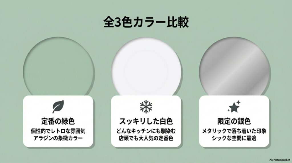 量販店で働いていた頃、「アラジンといえばグリーン」という印象をお持ちの方が多かったです。ただ、キッチンに白やグレーのアプライアンスが多い場合はホワイトの方が自然に溶け込むケースも多く、実際の店頭での人気もホワイトとグリーンで二分していました。