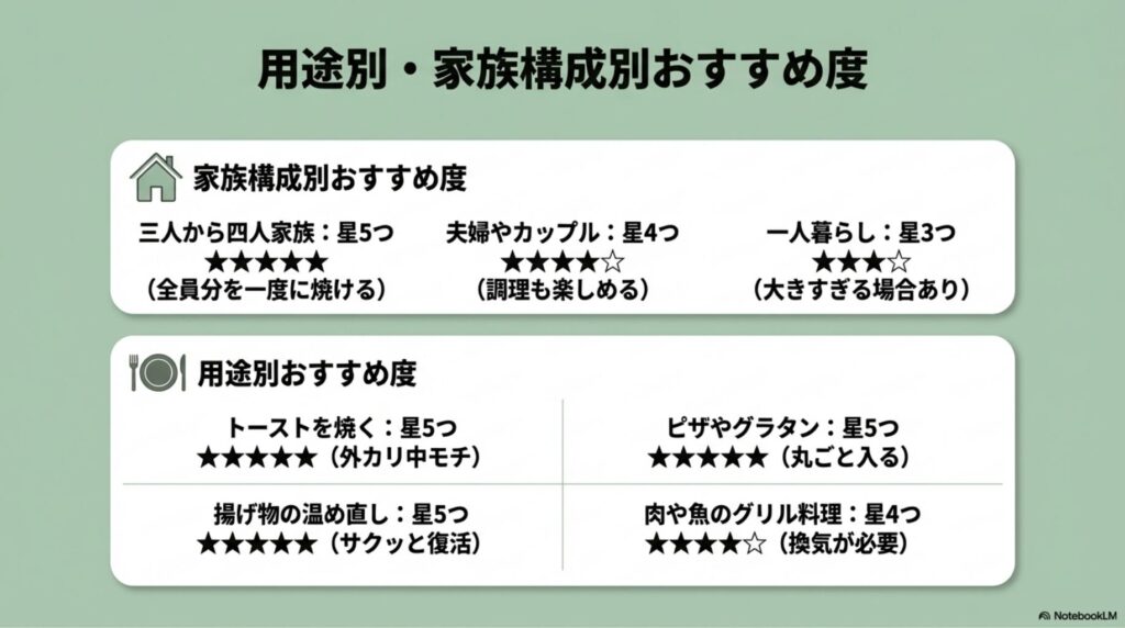 | 四人家族以上 | ★★★★★ | 全員分を一度に焼けて本領発揮 |
